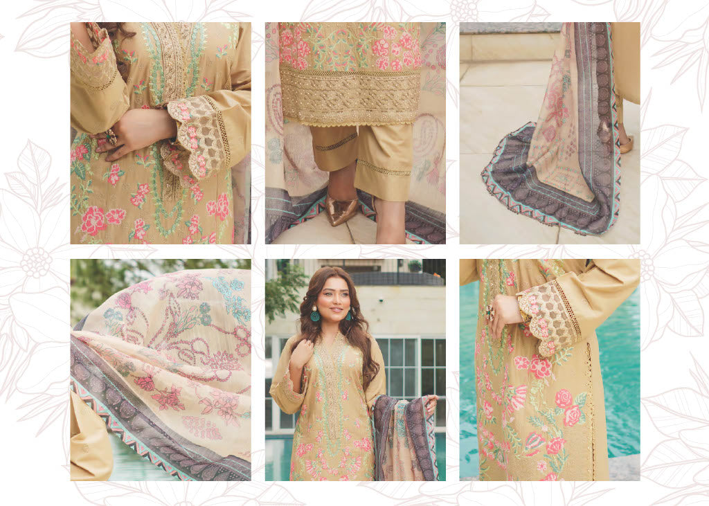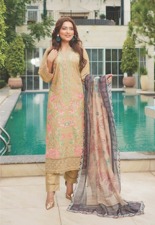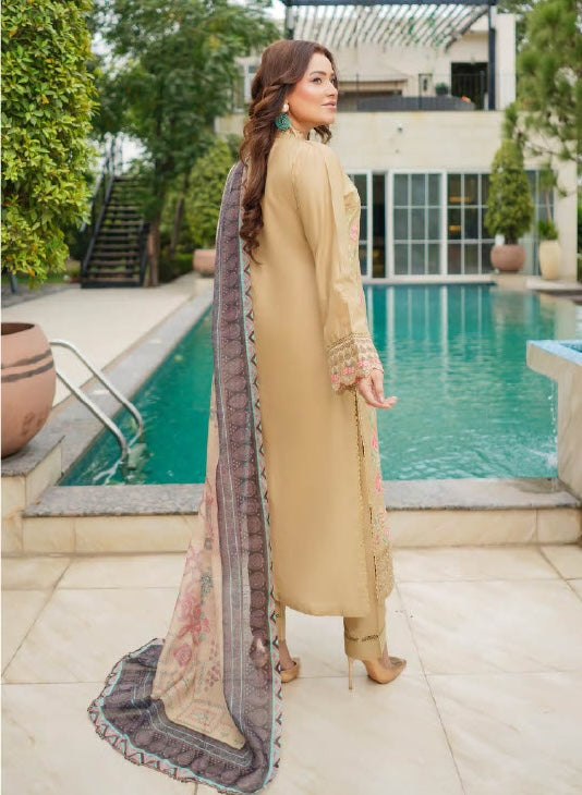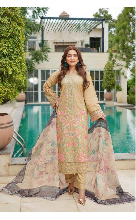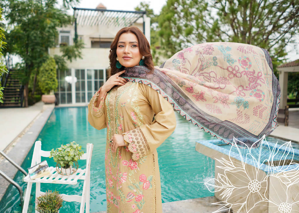 Experience the exquisite craftsmanship of Munira Designers with this elegant ensemble featuring intricate full heavy embroidery on the front baby fabric. Complemented by a beautifully printed Monal Dopatta, this outfit combines traditional artistry with refined style, perfect for special occasions where sophistication and detail matter.